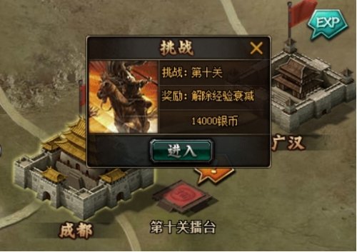 玩家可在世界地图中清缴叛军、山贼或马贼来获取大量经验、银币等资源;
