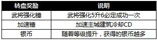 转盘送好礼,限时1天银币转盘大放送,活动期间玩家通过转转盘可以获得银币、加速锤,以及能够必定5升6强化成功的武将强化锤,祝各位将军征战四方,所向披靡!