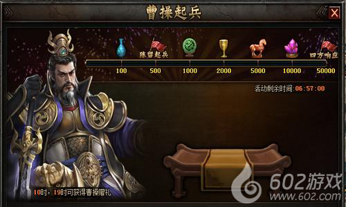 活动内容:活动期间,通过充值资助曹操可获得曹操回赠的赠礼!同时玩家在10点或19点可获领取免费曹操赠礼,宝箱内可开出10金币。