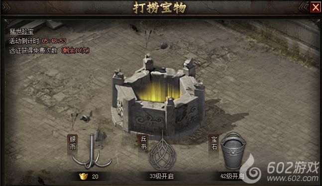 活动内容:活动期间,玩家可使用不同打捞工具在井中打捞宝物。每次打捞必定获得银币、兵书或宝石奖励,同时也有概率获得稀世珍宝!