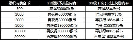 注:消费所赠送的银币或兵书,可累积领取(例:32级玩家累计消费满5000金币,共可获得360000银币)