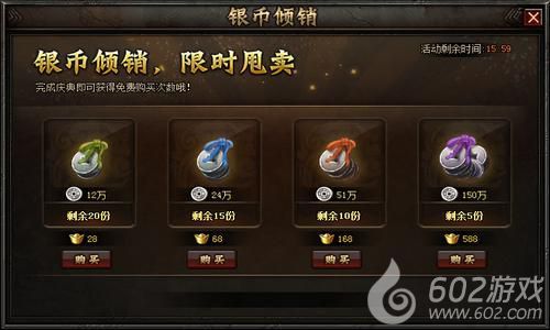 活动内容:活动期间,玩家可花费金币购买不同档次的银币礼包,等级越高每档银币越多;同时玩家每次完成庆典或国君犒赏可获得1次第一档免费银币购买次数。