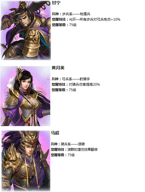 本次将开放弓、骑、步三系各一名紫色将觉醒,觉醒后可获得一项觉醒特技,并更换最新霸气图鉴。