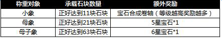 活动内容:活动期间,玩家通过给小象、母象或母子象称重来获得宝石或宝石合成卷轴奖励,且增加石块达到指定数量还可获得曹操赐予的额外奖励。