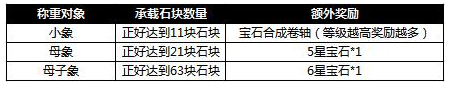 活动内容:活动期间,玩家通过给小象、母象或母子象称重来获得宝石或宝石合成卷轴奖励,且增加石块达到指定数量还可获得曹操赐予的额外奖励。