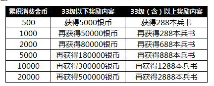 注:消费所赠送的银币或兵书,可累积领取(例:32级玩家累计消费满5000金币,共可获得360000银币)