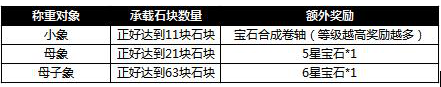 活动内容:活动期间,玩家通过给小象、母象或母子象称重来获得宝石或宝石合成卷轴奖励,且增加石块达到指定数量还可获得曹操赐予的额外奖励。