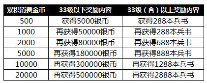 注:消费所赠送的银币或兵书,可累积领取(例:32级玩家累计消费满5000金币,共可获得360000银币)