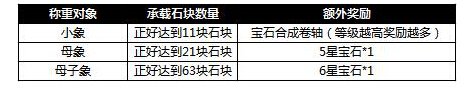 活动内容:活动期间,玩家通过给小象、母象或母子象称重来获得宝石或宝石合成卷轴奖励,且增加石块达到指定数量还可获得曹操赐予的额外奖励。