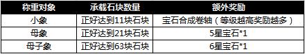 活动内容:活动期间,玩家通过给小象、母象或母子象称重来获得宝石或宝石合成卷轴奖励,且增加石块达到指定数量还可获得曹操赐予的额外奖励。